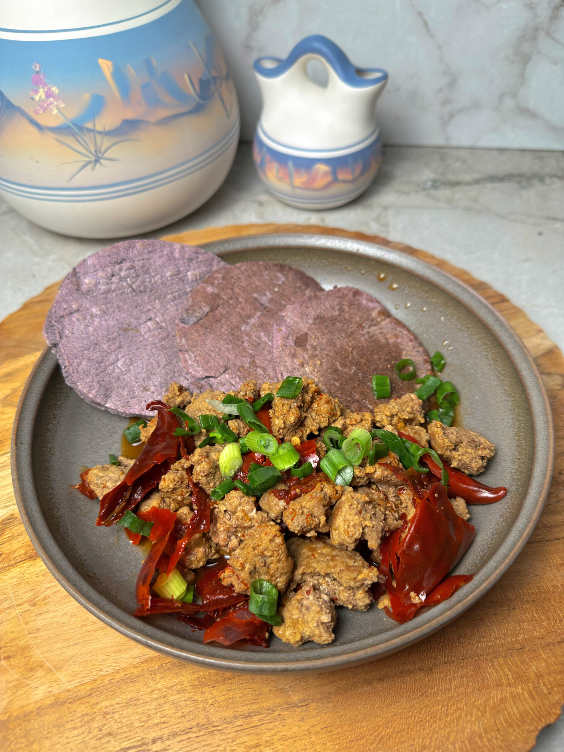 The meal on this plate has three components, all of which are archaeologically documented in the Four Corners region during the Classic Period: blue corn ground into meal and cooked as a flat cake on a hot surface, venison as the primary protein, and dried chiles as the dominant flavoring agent.