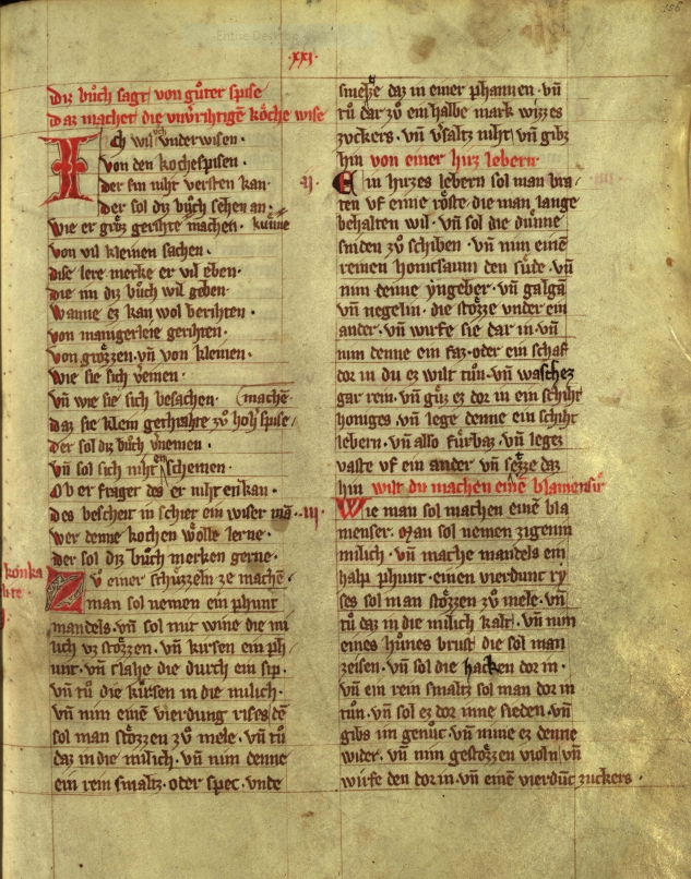 The recipe comes from Ein Buch von guter Spise (“A Book of Good Food”), transcribed by Hans Hajek and translated by Alia Atlas. The manuscript is considered the earliest known German-language cookbook, compiled around the 1340s. The medieval German version reads: