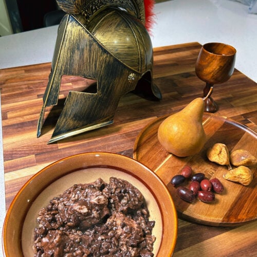 The black broth was made from pork, its blood, vinegar, and barley, simmered together until the pot turned almost ink dark. According to Plutarch, a visiting Sicilian cook tasted the broth and joked that once he tried it, he understood why Spartans were fearless in battle. The broth is intense, iron rich, and surprisingly simple. Blood was the thickener, vinegar kept it from clotting, and barley added the calories needed to finish the day. When I made my version, I served it with a pear, more figs, and a handful of olives, which aligns with what we know about Spartan agricultural staples. It is not a meal designed for pleasure, but it has a primal quality that fits the culture that created it.