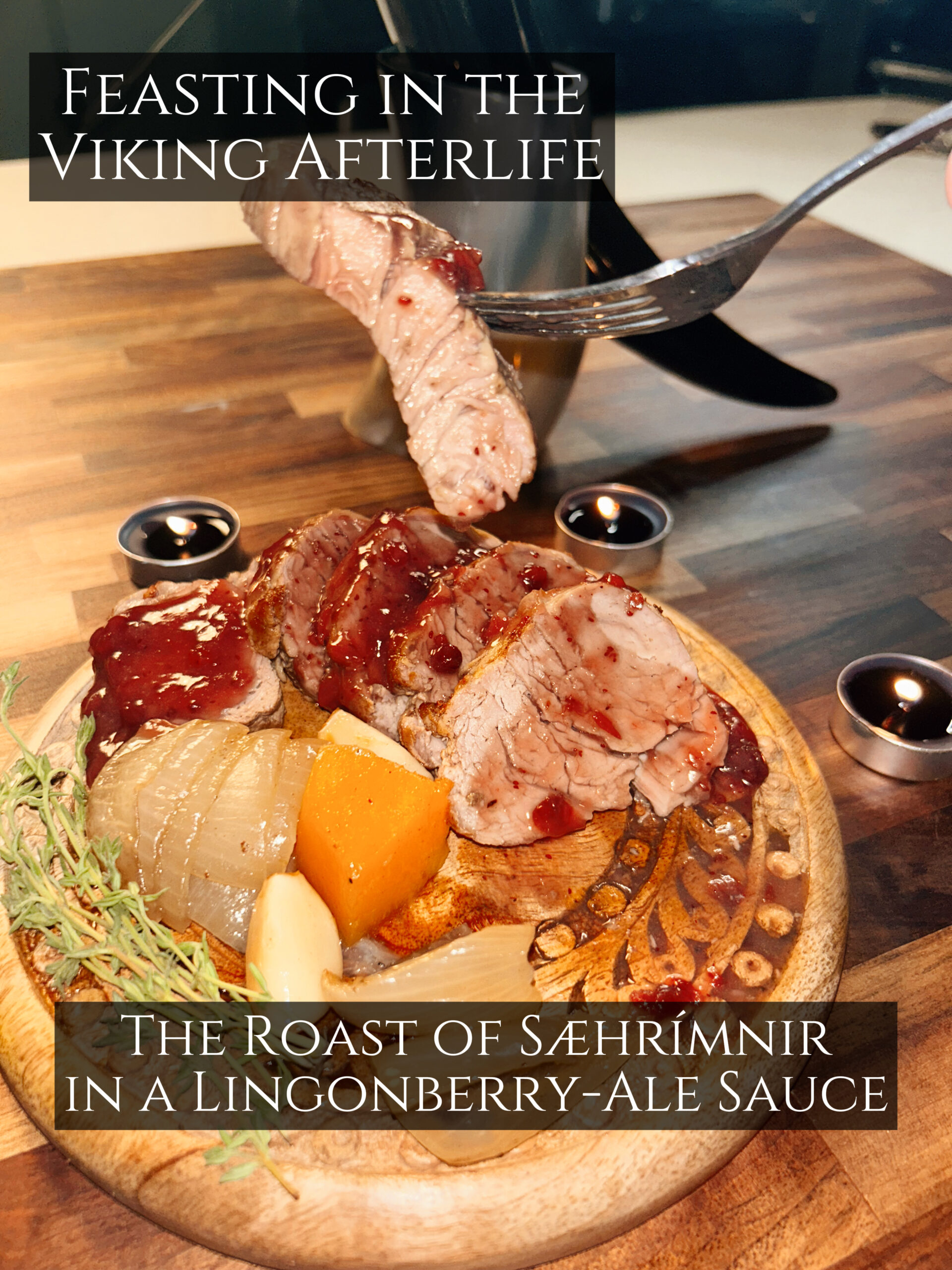 To honor this legend, I recreated the eternal feast of Valhalla with a dish that felt both rustic and celebratory. Pork was my natural stand-in for Sæhrímnir. A pork tenderloin, seared in a cast iron skillet until golden brown, carried the rich flavor that would have filled a Viking hall. Root vegetables like onions, turnips, and garlic surrounded it, absorbing the meat’s juices as they roasted. This combination would have been familiar to the Vikings, who relied heavily on what the land and season provided.
