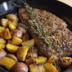 Serve the well-done New York strip steaks alongside the crispy roasted potatoes.