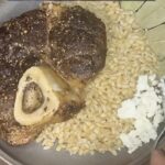 Thigh-Roasted Beef with Barley & Laurel is a single-serving dish inspired by ancient Greek sacrificial rituals to Zeus. It features a seared and slow-roasted beef shank (symbolizing the fat-wrapped thighbone burned for the gods), served over a bed of tender pearl barley—a staple grain in Greek offerings. The meat is infused with salt and coriander seeds, evoking sacred herbs used in ritual cooking.